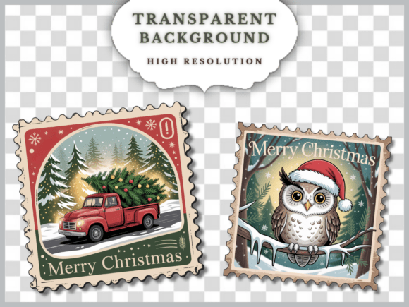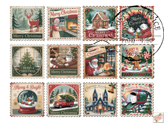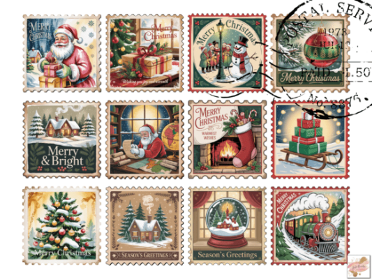 Vintage Christmas Stamps Png Bundle, Vintage Christmas Clipart Bundle, Retro Santa, Snowman, Christmas Tree, Merry Christmas, Sublimation Designs