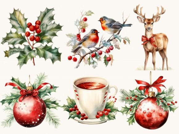 22 high-quality watercolor illustrations featuring vintage Christmas elements like ornaments, holly, stockings, and more 🎨🌿