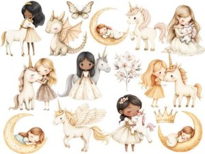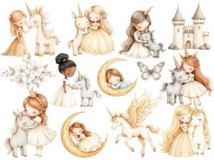 This collection includes: 73 elements, Watercolor baby dreamy princess moon clipart, Cute black princess and unicorn clipart, Little princess png, Magical Baby castle clipart, princess clipart, princess and unicorn, princess moon png, black princess png, dreamy princess png, moon princess, cute unicorn clipart, little princess png, magical kingdom png, fairy tale castle, watercolor princess, baby castle clipart, cute princess png