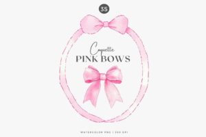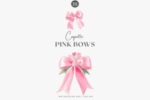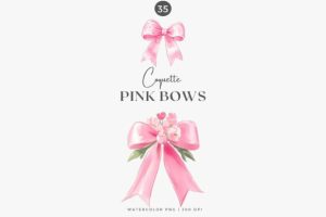 Watercolor clipart of pink bow elements, perfect for coquette bows, png illustration, pink ribbon designs, girly clipart, and floral bow crafts.