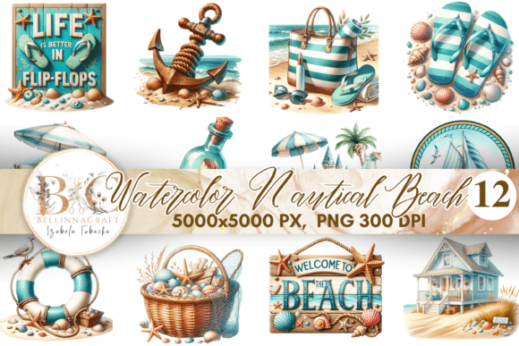 This is a beautiful set of 12 Watercolor Nautical Beach Clipart, Sailor Graphics, Vintage Beach, Nautical Ocean Png, Summer Clipart, Sea watercolor collection, Beach PNG.