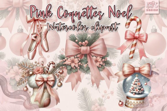 Watercolor Pink Coquette Christmas Noel Clipart Collection | Romantic Christmas Holiday Designs.