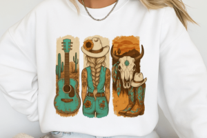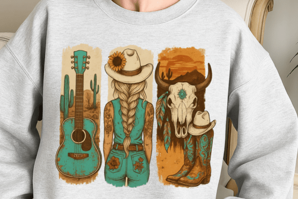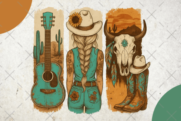 Celebrate rustic charm and cowgirl spirit with this beautifully hand-drawn Western Cowgirl Brushstroke PNG. This high-resolution sublimation design features four vertical brushstroke-style panels, each filled with bold Southwestern flair — including a turquoise guitar with desert cacti, a blonde cowgirl in a wide-brim hat and braids, a bull skull with feathers and turquoise accents, and a pair of detailed cowboy boots with matching hat.